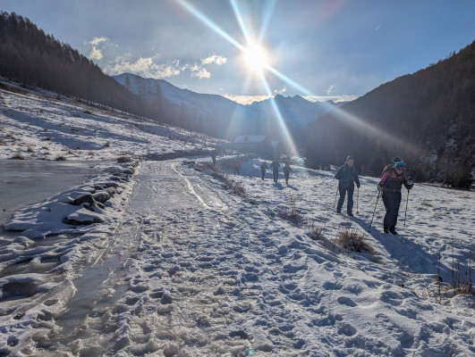 La partenza dell’escursione era nella frazione di San Apollonia di Ponte di Legno, a quota 1600 m s.l.m. All’arrivo al parcheggio c’erano –6 gradi, ma fortunatamente eravamo “scaldati” dal sole che si stava alzando nel cielo.