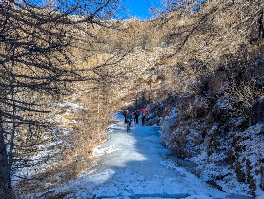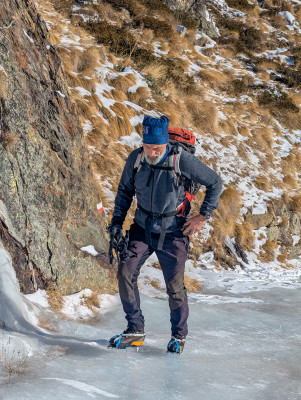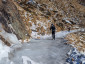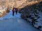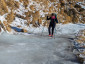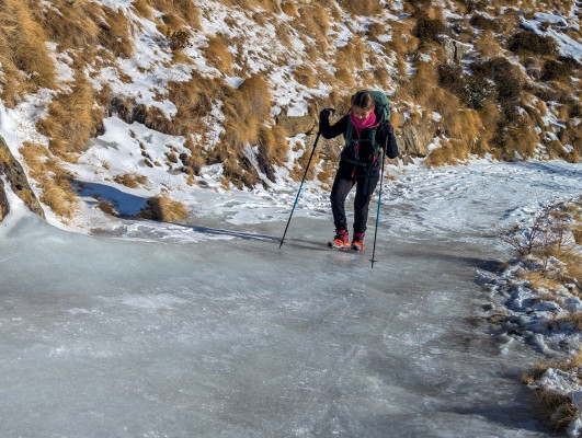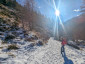 L’inizio del sentiero era molto piacevole, in quanto seguiva una strada sterrata senza pendenze faticose; però, dopo poche centinaia di metri, il sentiero era ricoperto da uno spesso strato di ghiaccio vivo, che ci ha obbligati a indossare i ramponcini (o i ramponi per alcuni).
