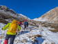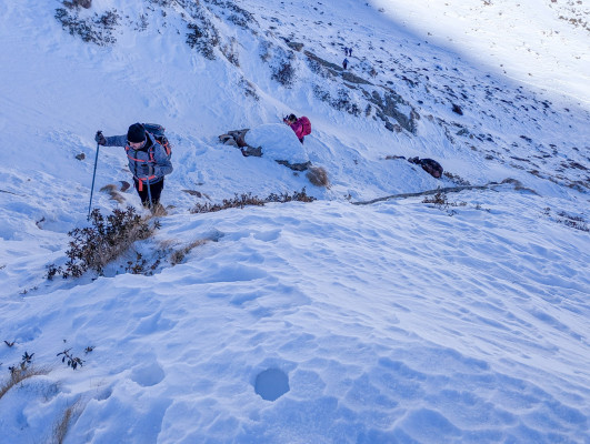 Richiamata da mio papà, indossiamo anche le ghette, che ci permettono di proseguire molto più spediti… oddio, neanche troppo, visto che ora la salita è bella tosta e comincio ad avere dei ripensamenti sulla scelta di essere venuta.