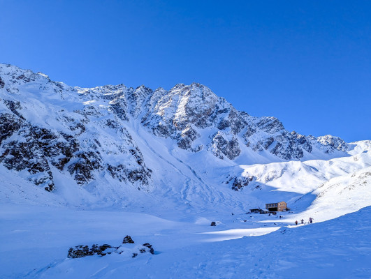 Dopo circa mezz’ora di fatica arriviamo al Bivacco Linge, situato in mezzo alle montagne, che impediscono ai raggi del sole di scaldarci; infatti avvertiamo tutti molto freddo (ci saranno stati –15/–20 gradi).